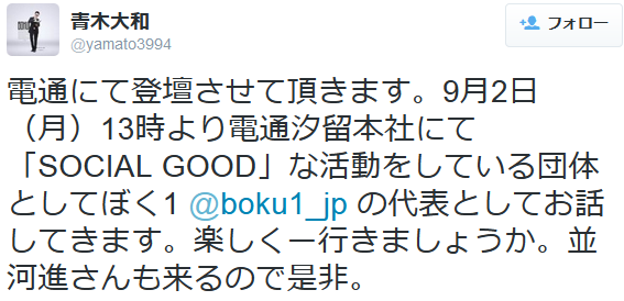 【@why_kaisan騒動】小4役の青木大和氏、電通と繋がっていたwwwww http://ift.tt/1y4CSRc 2:名無しさん@0新周年@\(^o^)/:2014/11/24(月) 19:00:34.98 ID:nJioQ8rY0.net 青木大和@yamato3994 電通にて登壇させて頂きます。9月2日(月)13時より電通汐留本社にて「SOCIAL GOOD」な活動をしている団体としてぼく1 @boku1_jp の代表としてお話してきます。楽しくー行きましょうか。並河進さんも来るので是非。 http://t.co/btNzNLmSp1 2013/08/24 21:37:51 http://ift.tt/1v2c9nohttp://ift.tt/1AGhNA2 続きを読む