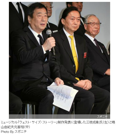 鳩山由紀夫元首相、米国の初代女性大統領の役でミュージカル出演 http://ift.tt/1z2FfHo 1:Baaaaaaaaφ ★@\(^o^)/:2014/12/17(水) 14:51:24.94 ID:???0.net 作曲家・三枝成彰(72)が団長を務める六本木男声合唱団倶楽部による ミュージカル「ウェスト・サイズ・ストーリー」(来年1月14、15日、東京・渋谷オーチャードホール)の制作発表17日、都内で行われた。ミュージカルの名作で映画化もされた「ウエスト・サイド物語」をもじり、「WEST SIDE」ではなく「WAIST SIZE」(腰のサイズ)を意味するタイトル。 出演者約120人の平均年齢62・2歳、平均ウエストサイズは89・4センチで、 三枝氏は「ようするにデブばっか」と自ちょう気味に話した。会見には、鳩山由紀夫元首相(67)、前WOWOW社長で最年長の佐久間昇二氏(83)、 柿沢未途衆院議員(43)ら主要キャストが出席。米国の初代女性大統領という役どころの 鳩山氏は、「女性らしく歩いてみようと思って、奇妙な格好で歩いたりしている」と説明。 日本赤十字社の近衛忠輝社長(75)のキスシーンがあり、三枝氏から実践を求められたが、 「練習でも1回もしていない。本番でしかやらないから」と照れた。先の衆院選の感想を求められると、「解散、総選挙があったんですか?」とオトボケ。 それでも、柿沢氏をチラリと見やり「総選挙で何人かの人はこのミュージカルに影響があった。 まあ、だいたいの人は迷惑だったでしょう。そう、言わせたいわけですよね」と語った。その衆院選で当選した柿沢氏は、「モップダンスというものがあり、マスターしかけた頃に 選挙になって、すべて忘れた。声もつぶれた」と苦笑い。それでも、「今回初めて映画を見て、 そのリメイクを演じられるのは光栄。年明けは新年会回りで忙しいが、14、15日はきっちり スケジュールを空けます」と笑顔を見せていた。http://ift.tt/1GOqiry 続きを読む