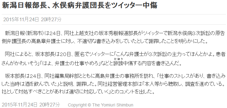 - ^ 新潟日報部長、水俣病弁護団長をツイッター中傷読売新聞 2015年11月24日